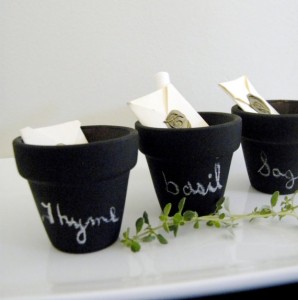 Incorporating potted herbs into your reception décor is a natural fit for a country wedding setting, but adding textured greenery can also provide a stunning natural element to a modern and sleek reception style. Visit a farmer’s market to buy high quality potted herbs then divide and replant them into small containers. For the country wedding, choose burlap pots tied with a strand of lace or ribbon to match the reception colors. For the modern wedding, buy sleek pots in bulk such as these cool chalkboard pots from etsy.com. Cluster the potted herbs on guest tables or create a display with a sign inviting guests to ‘please pick one’ as a parting favor.
